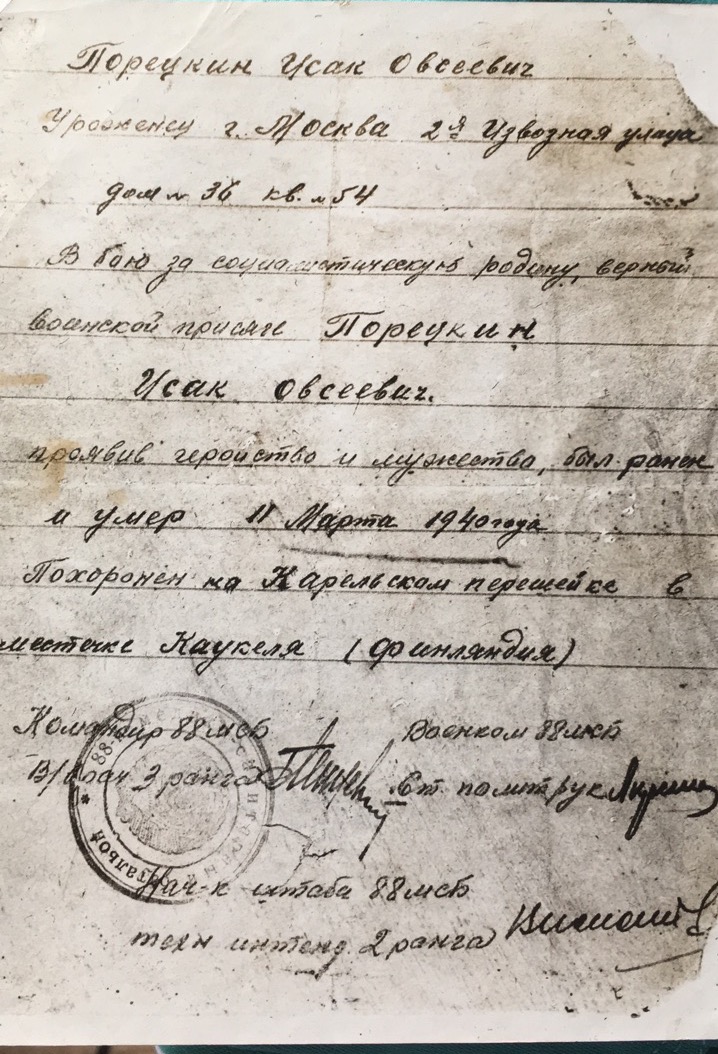 Re: Порецкин Исак Овсеевич, 11 марта 1940 г., Каукеля