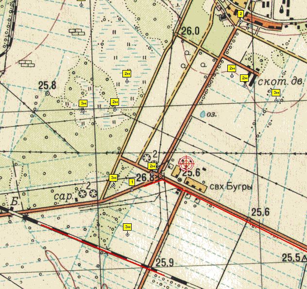 Вызывает любопытство точка 2м у перекрестка. Там сейчас незастроенное место с свободным доступом, возможно там обнаружится земляной холм - бывший ДЗОТ.