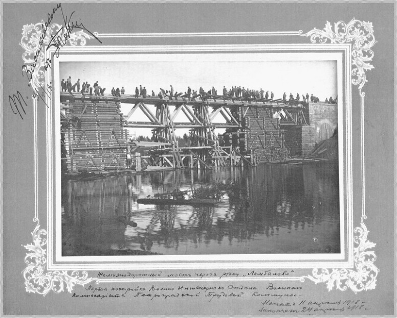 1918 апрель Общий вид строительства железнодорожного моста через реку Лембалово вт.jpg