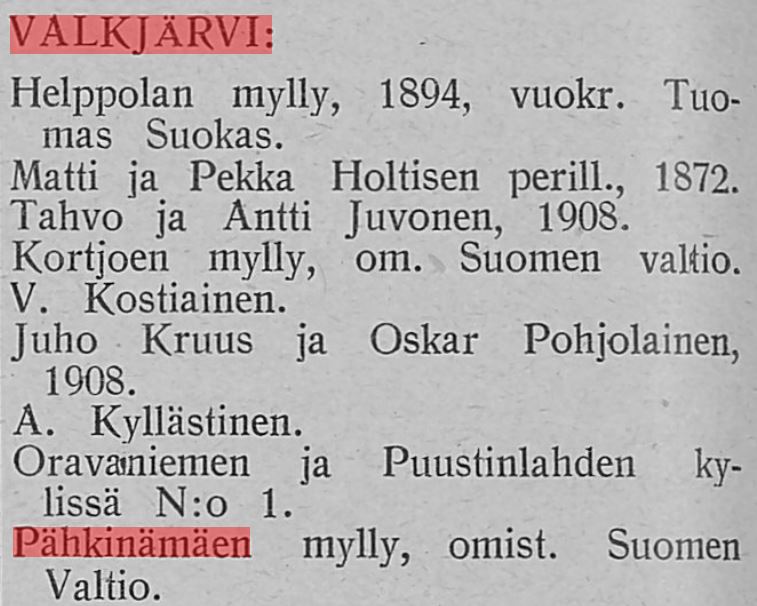 "Это печальное воспоминание о времени, когда финское государство после выкупа донационных земель решило научить крестьян Валькъярви обрабатывать землю. Было построено величественное швейцарское двухэтажное главное здание с более чем 20 комнатами. Красивые веранды наверху и внизу. Земля вокруг двора была осушена дренажом. Это все была «модель» того, каким должен быть дом фермера. Усадьба теперь продана кооперативу и, вероятно, будет снесена. Сотни тысяч государственных денег были потеряны."