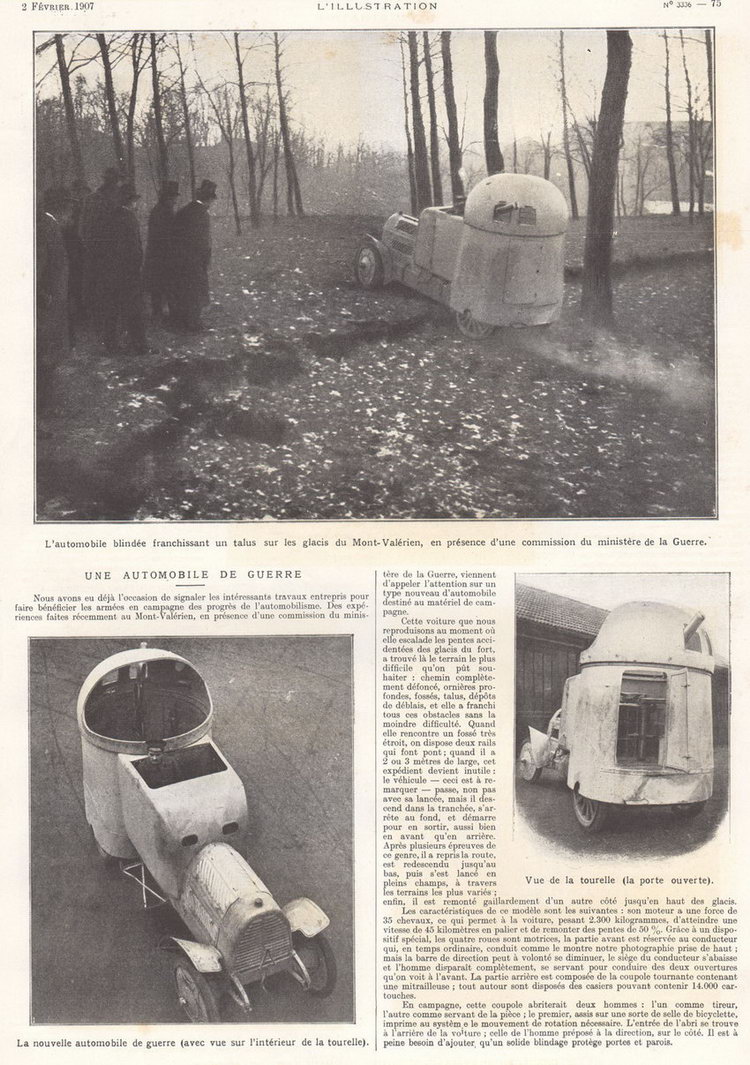 Страничка из французского журнала "L'Illustration" от 2 февраля 1907 года На верхнем фото - "Бронированный автомобиль пересекает набережную на гласисе [форта] Mont-Valérien в присутствии комиссии военного министерства." Mont-Valérien - форт ныне в пригороде Парижа, чуть западнее Булонского леса.