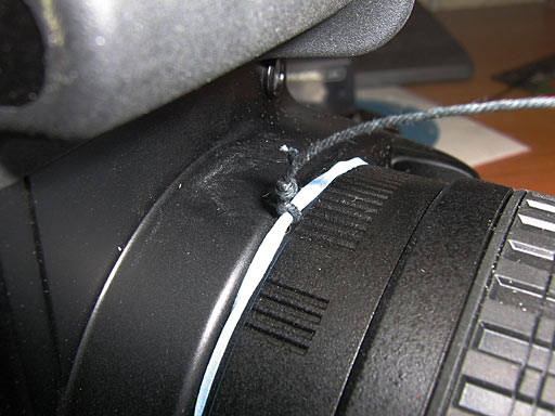 2. Привязал 1мм ниточку длиной из расчета полностью выдвинутого зума. Ниточка продета в отверстие и на ней завязан узелок, чтоб обратно не выскочила.