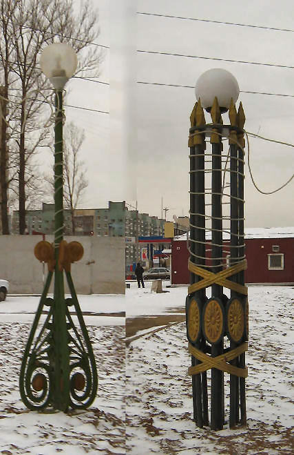 Правый похож на фонари на 1-ом Садовом, без навершия и вместо навесного фонаря - плафон.