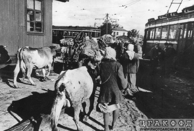 Тоже с Спб фотоархива. Судя по подписи "Обоз с беженцами из прифронтовых районов, пригородов Ленинграда, на одной из улиц города", это где-то в южных районах. Дата съемки 2 сентября 1941г.