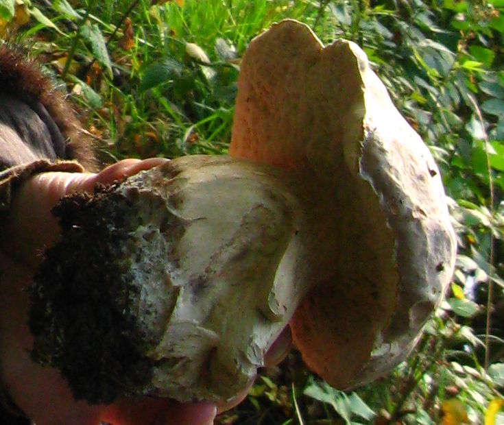 Экстерьер очень похож, но шляпка сверху серая, а ножка имеет выраженный сетчатый рисунок. Черви их едят активно, а на сломе шляпка выглядела чуть более похожей на... хм... вот как будто разломил суфле.