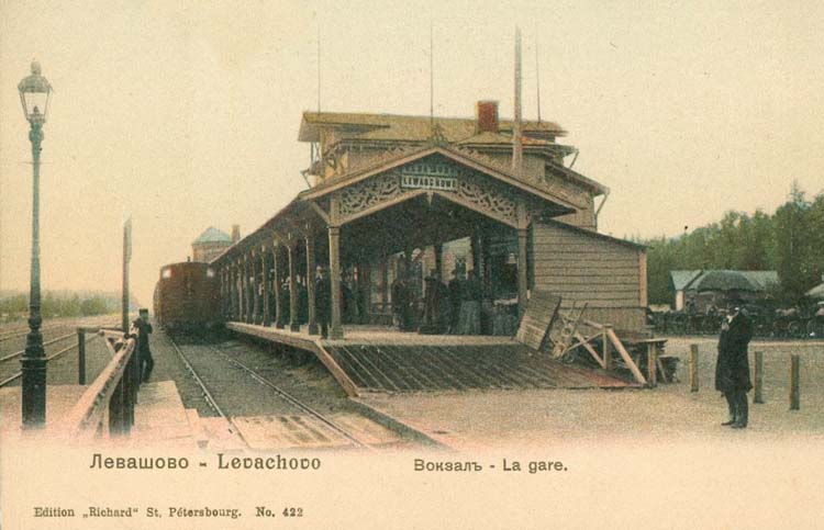 Для остальных привожу дореволюционные изображения деревянных вокзальных построек трех соседних станций по Финляндской железной дороге: Левашово, Дибуны, Белоостров. До появления ст. Графская (Песочная) в 1912г. они представляли собой последовательность остановок поезда.