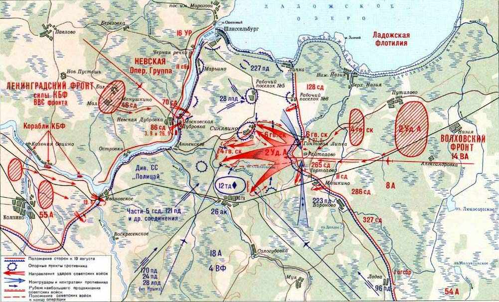 Вот две схемы 3-й Синявинской операции - наша и немецкая. Там указано максимальное продвижение наших войск.