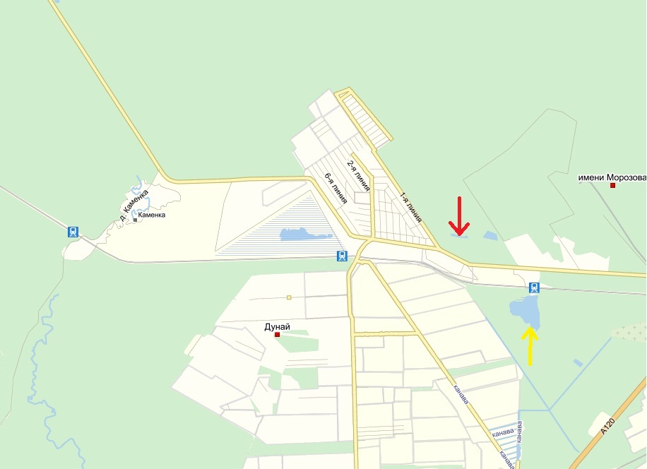 Мы, дунайские мальчишки, купались либо в противопожарных водоемах, либо ездили на великах на очень мелкий карьер в лесу (красная стрелка)