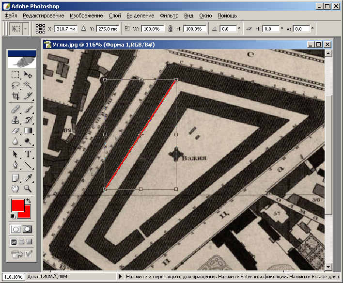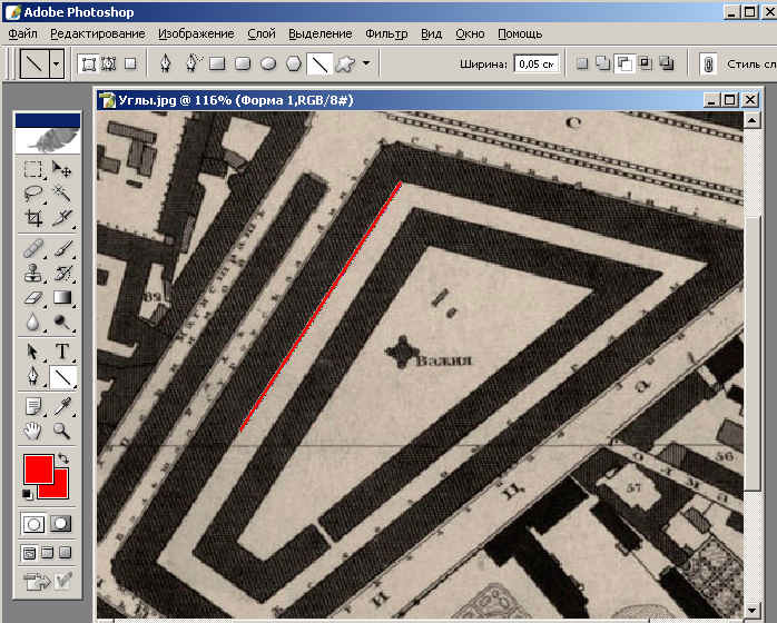 Допустим хотим померять угол между Суконной (Невской) и Большой Суровской (Перинной) линиями Гостиного Двора.