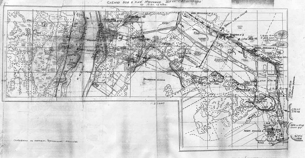 | Цитата: | Бойцы и командиры первого батальона 123-й бригады, ворвавшись в рабочий поселок № 1, встречаются здесь с воинами первого батальона 1240-го полка 372-й дивизии... Вскоре, в 11 часов 35 минут, возле насыпи узкоколейной железной дороги, у рабочего поселка № 5 третий батальон (капитана Федора Собакина) 269-го полка 136-й дивизии, обходивший поселок с севера, сомкнулся с наступавшим со стороны Волховского фронта батальоном капитана Демидова 18-й стрелковой дивизии, которую вел в бой заместитель заболевшего командира ее полковник Н. Г. Лященко.