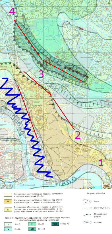 В районе цифр 3-4 проходит еще один уступ, сглаженный склон которого до сих пор заметен у Ланской и Кушелевки.