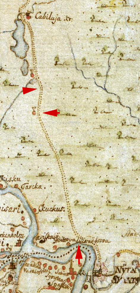 В результате просмотра карт можно точно определить место поворота дороги в северном направлении от Невы. Так же прослеживается поворот трассы примерно на полпути от реки до озер в направлении высокой песчаной гряды (см. геоморфологическую карту).