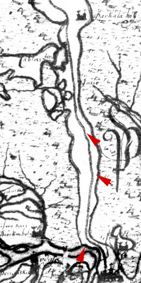 1678 г. Обратите внимание на место отворота дороги от Невы. Нева делает поворот, огибая песчаную гряду "Пески", и на северном берегу видны два более резких изгиба берега, они видны и на последующих картах. На севере фрагмента мне непонятны изгибы. Если картограф чертил карту с прилежанием, то изгибы показываю существенные повороты.