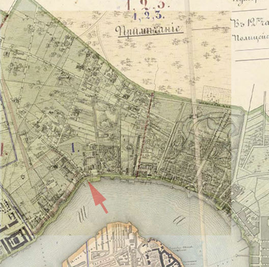 В 1828 году Шуберт отснял карту СПб и поместил на интересующем нас месте картуш, тем самым навсегда закрыв надежду узнать, что там под этим картушем. В то время район был депрессивным и не очень интересовал заказчика карты.
