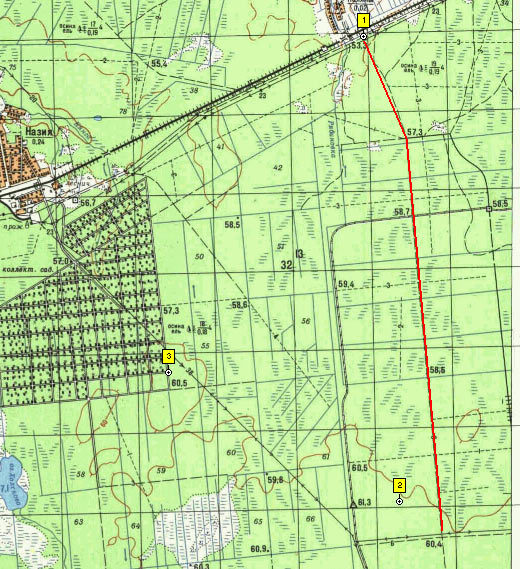 В качестве ориентира для движения можно выбрать ЛЭП, хотя что-то не припомню ее идущую через садоводство. Может просто внимание не обращал. От края садоводства до места - 3.5км